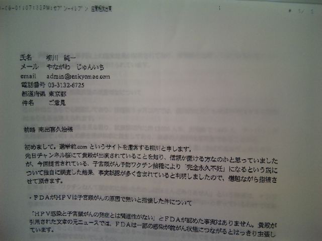 平成22年8月1日(日)に、神奈川県座間相武台東地区内のセブンイレブンから、「ご意見書」という件名にて、当事務局へ南出喜久治塾長宛ファックスが送られてきました。氏名が明記されているものの、住所の記載がなく、このような内容に関する書類については、事務局として塾長に渡すことが出来かねる旨を、ファックス文書に記載されている電話番号へ連絡したところ、この電話番号は現在使われていないものであるとのアナウンスが流れておりました。従いまして、どこのどなたで、どのような立場の方かを確認できない、また今回のように偽称でないことが確認できないような怪文書の類については、正式なご意見書書類として、当塾塾長へ提出できかねますこと、ここにお知らせさせていただきます。